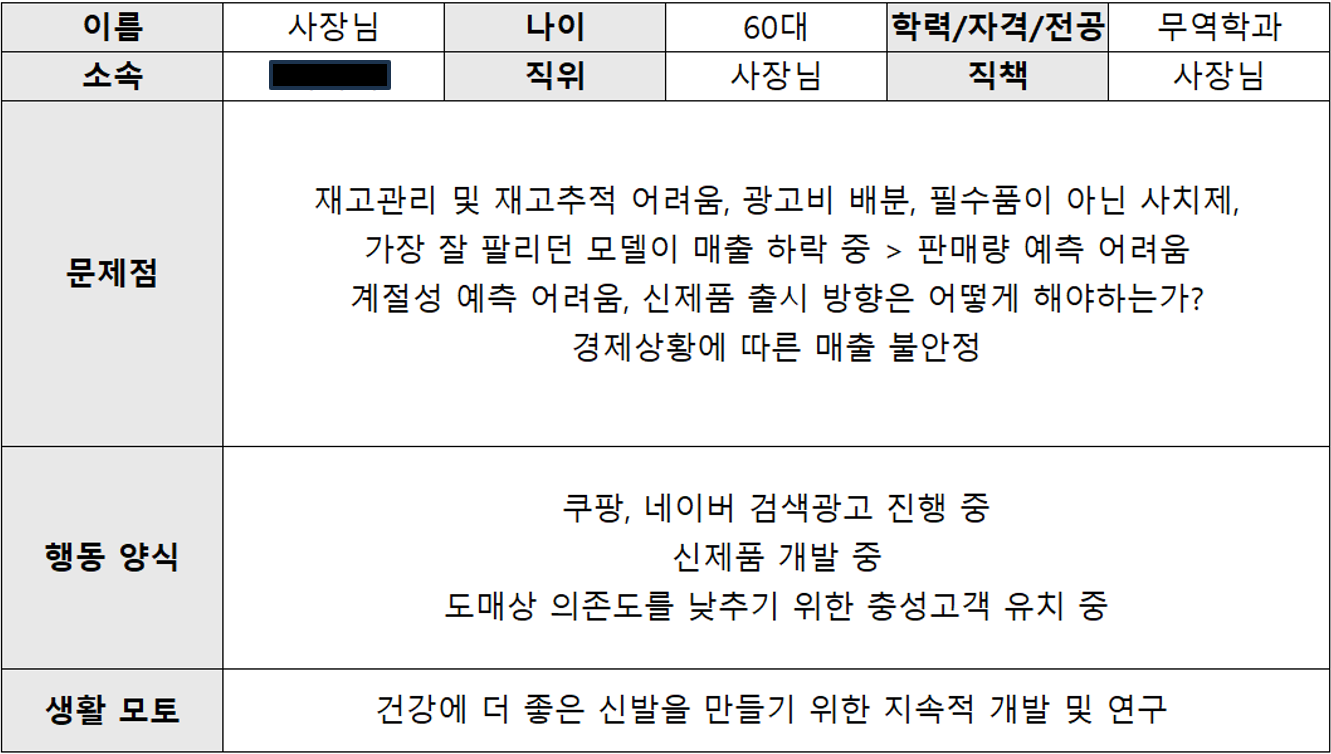 저희는 역시 상상력을 최대로 발휘하여 회사 사장님을 타겟 사용자로 설정하고, 아래와 같이 페르소나 정의서를 작성하였습니다.