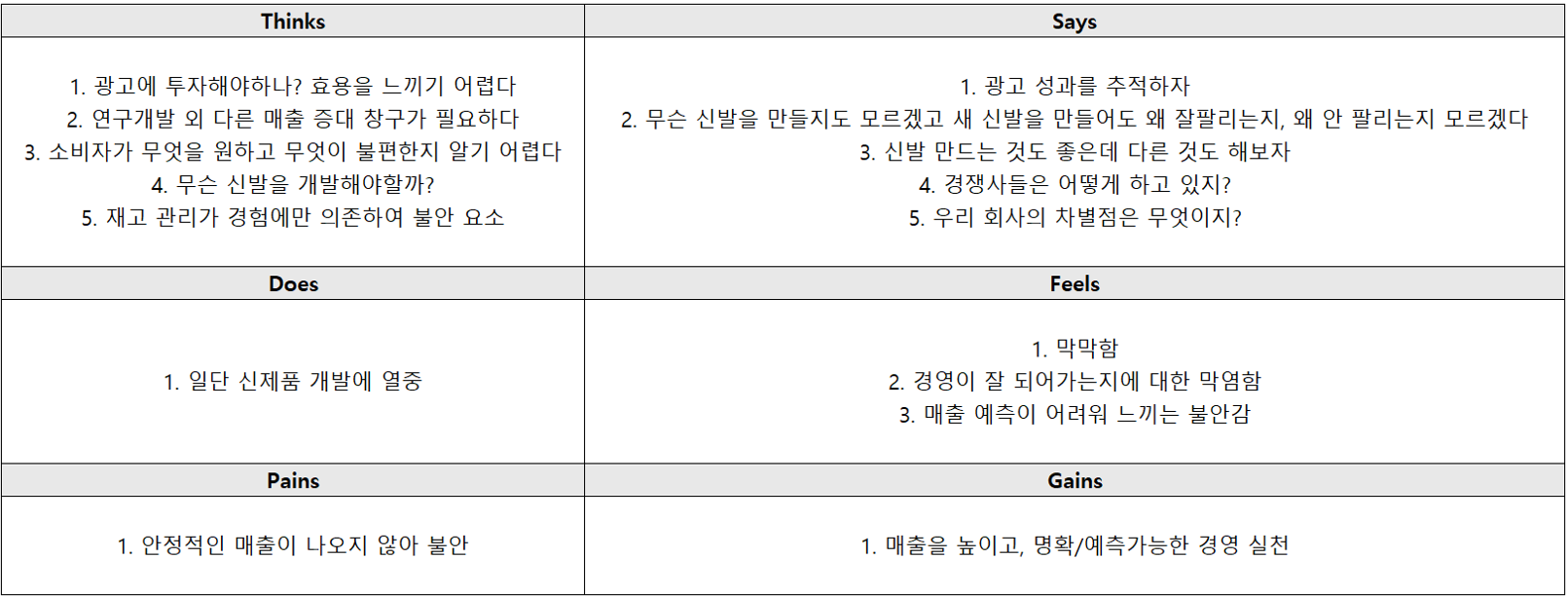 공감 지도는 원래 인터뷰, 관찰, 사용자 발언 등을 취합하여 작성해야 하지만, 편의상 저희의 상상력을 발휘하여 제작해보았습니다.