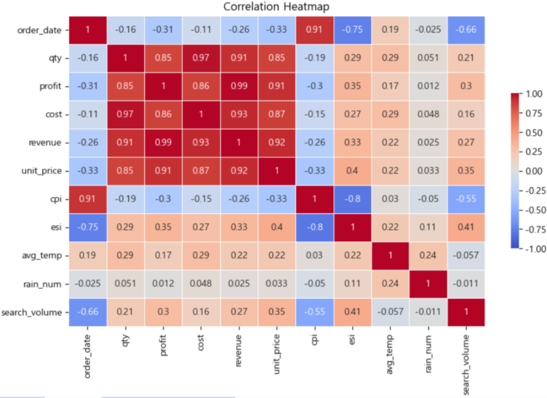 order_date와 외부변수 cpi, esi 간에 아주 강한 상관관계가 눈에 띕니다.